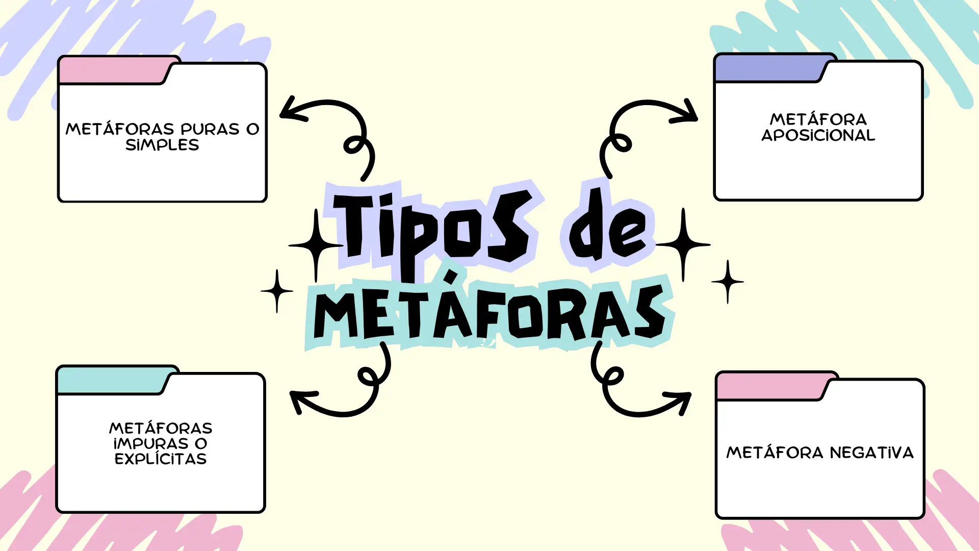 Ahora que conoces sus elementos debes saber que aunque existen varios tipos, todos tienen los mismos 3 elementos base que vimos con anterioridad. Estas metáforas se dividen en varios tipos porque se usan en distintas situaciones. Veamos cuáles son y sus ejemplos: