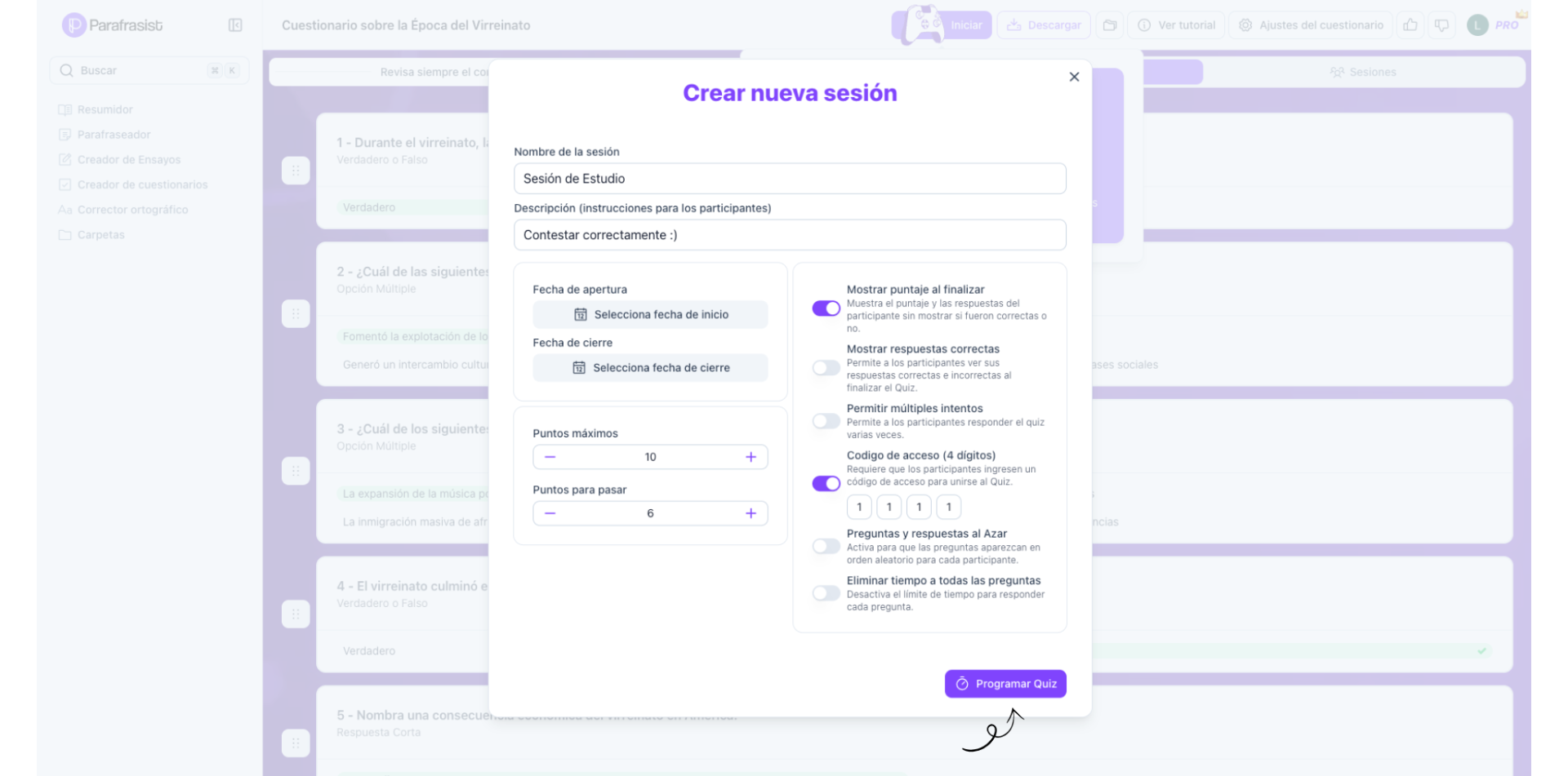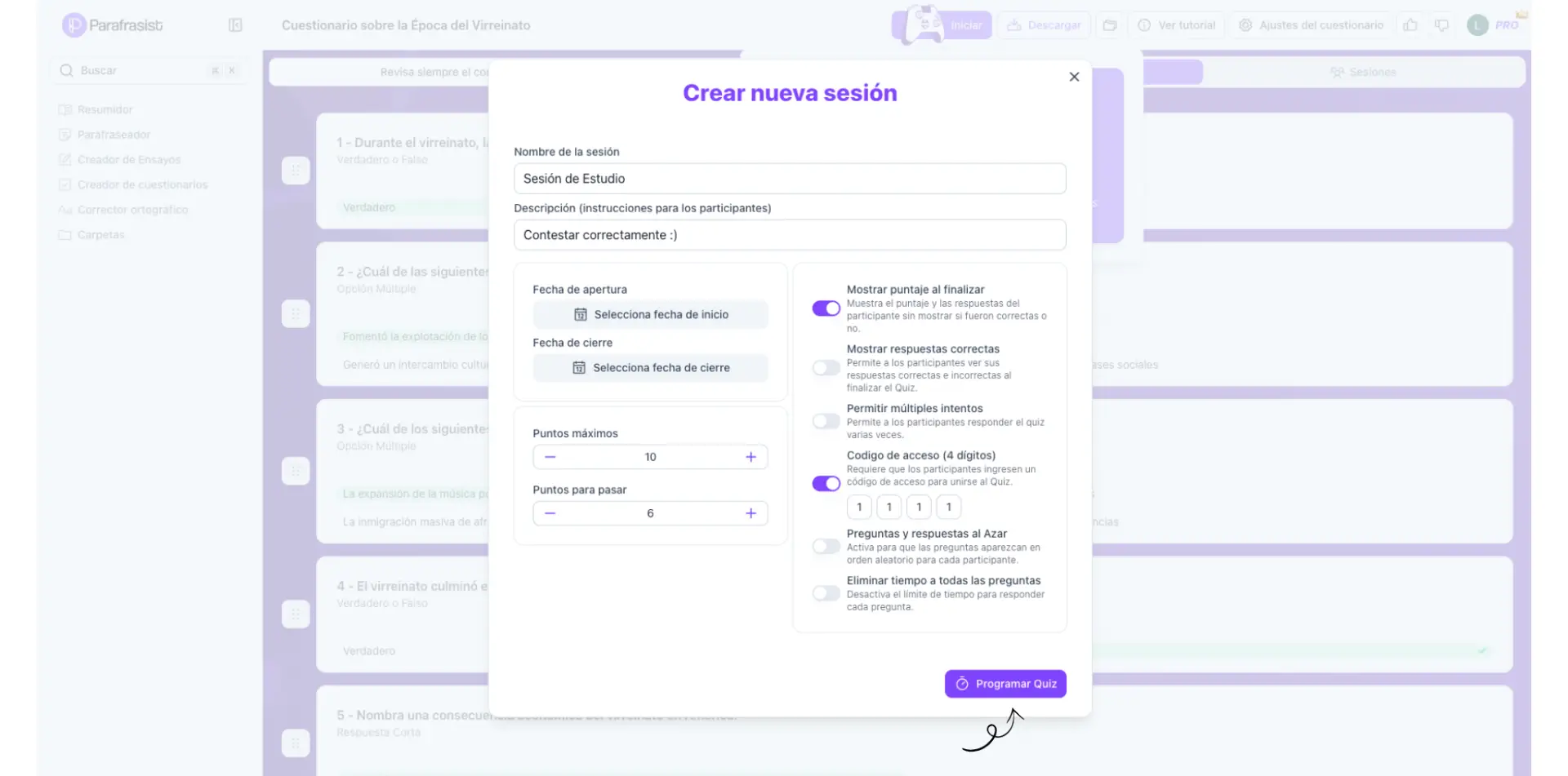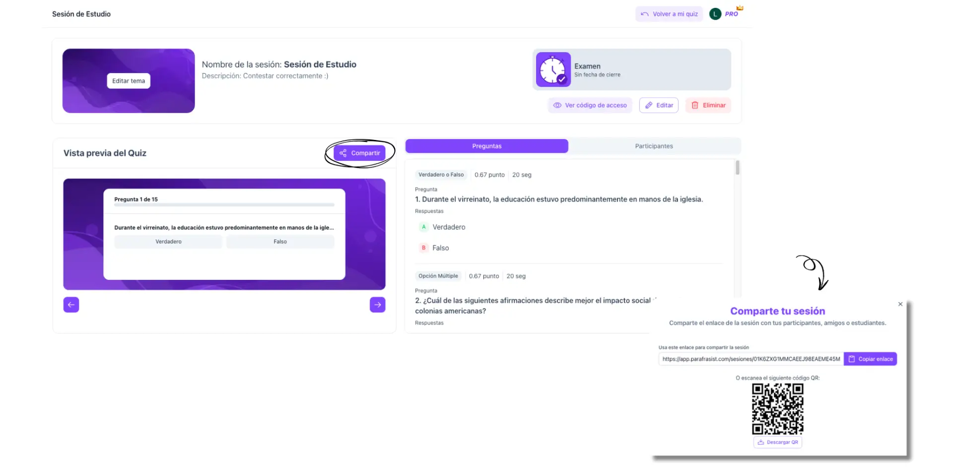 ¿Te imaginas poder compartir tus quizzes con tus amigos o con tus alumnos en segundos? Pues ahora, ParafraQuiz lo hace posible. Hemos creado una nueva función de sesiones para todos tus cuestionarios, con el que puedes enviar un enlace o compartir un código QR para que otras personas lo respondan desde su celular, tablet o computadora, sin complicaciones.