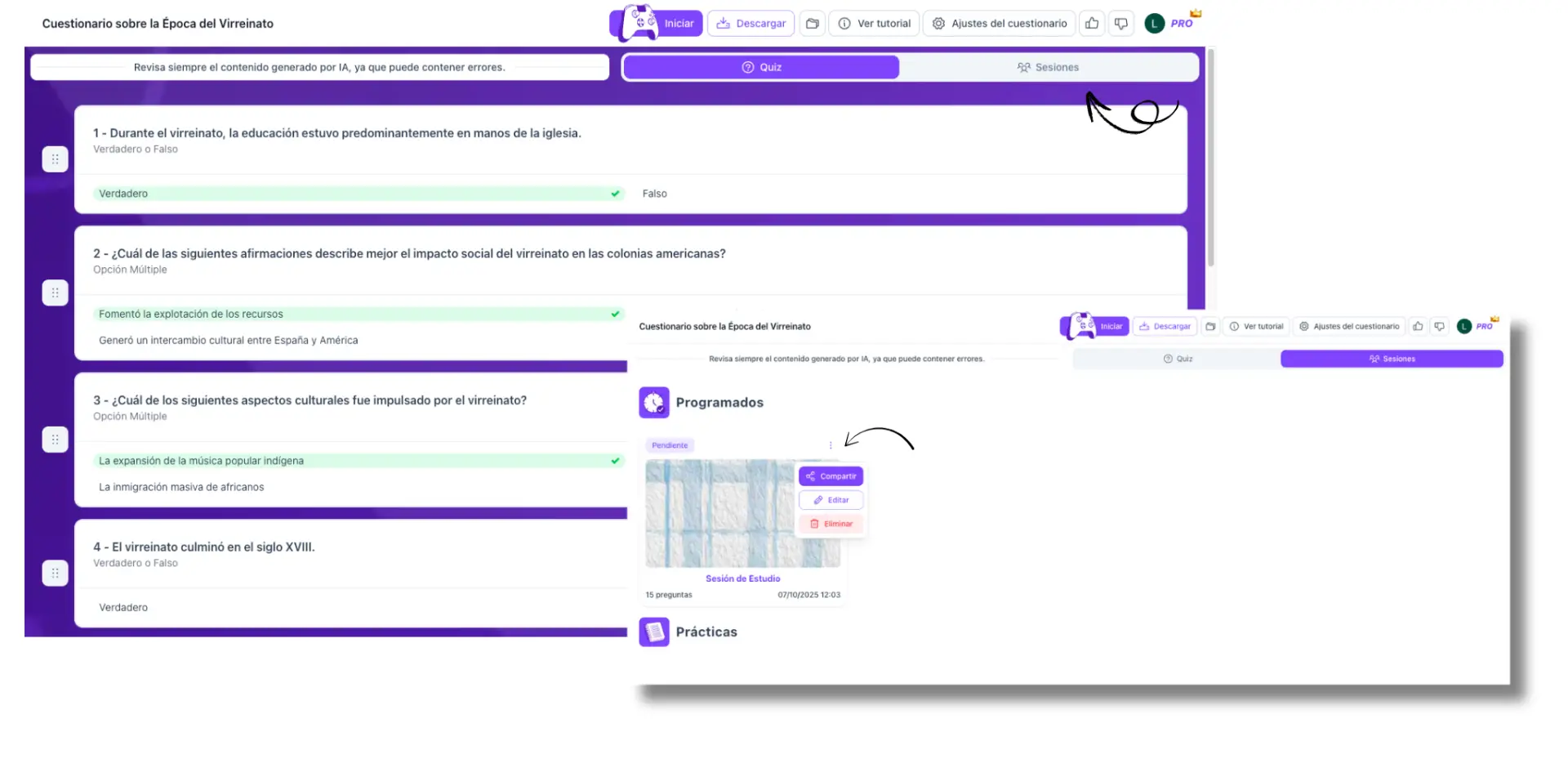 La función de “Practicar” es la que ya conoces, donde puedes practicar de forma individual. Recuerda, que puedes crear múltiples sesiones de un sólo cuestionario sin que una afecte a la otra.