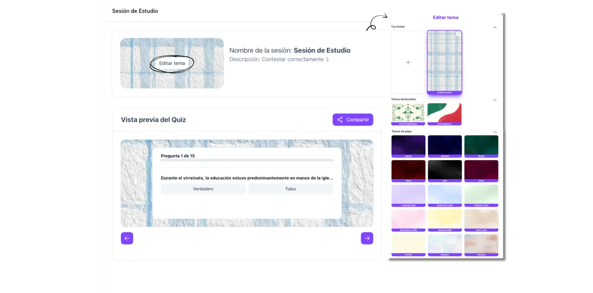 ¡Nuestra función favorita es la de temas! Creamos varios fondos para que puedas utilizarlos en tu quiz, o si lo prefieres también puedes subir una foto y crear tu propio tema para llevarlo a otro nivel.