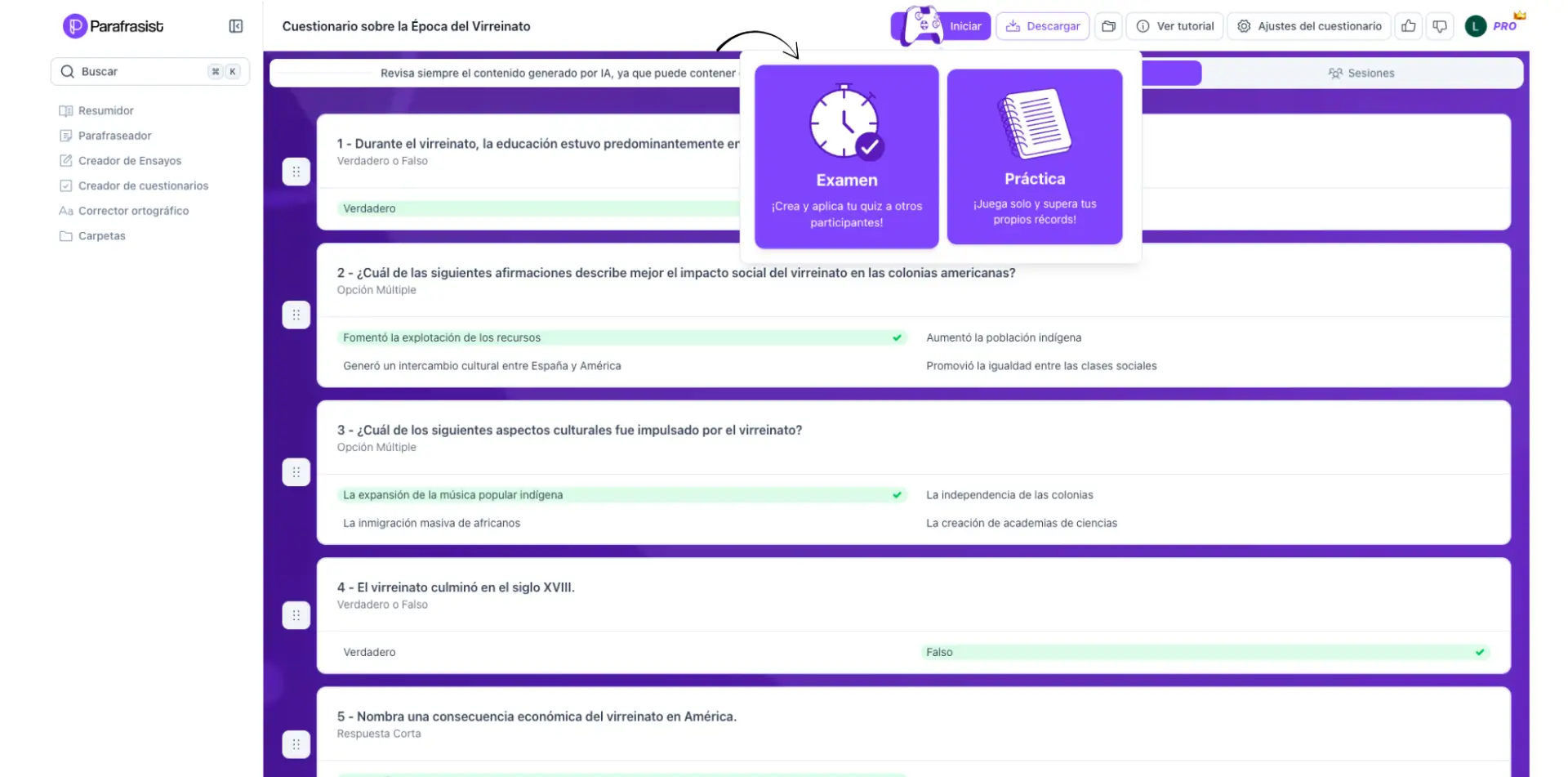 Ya no necesitas apps complicadas ni gastar tiempo, todo lo haces desde Parafrasist, desde el cuestionario automático hasta la sesión para compartir.