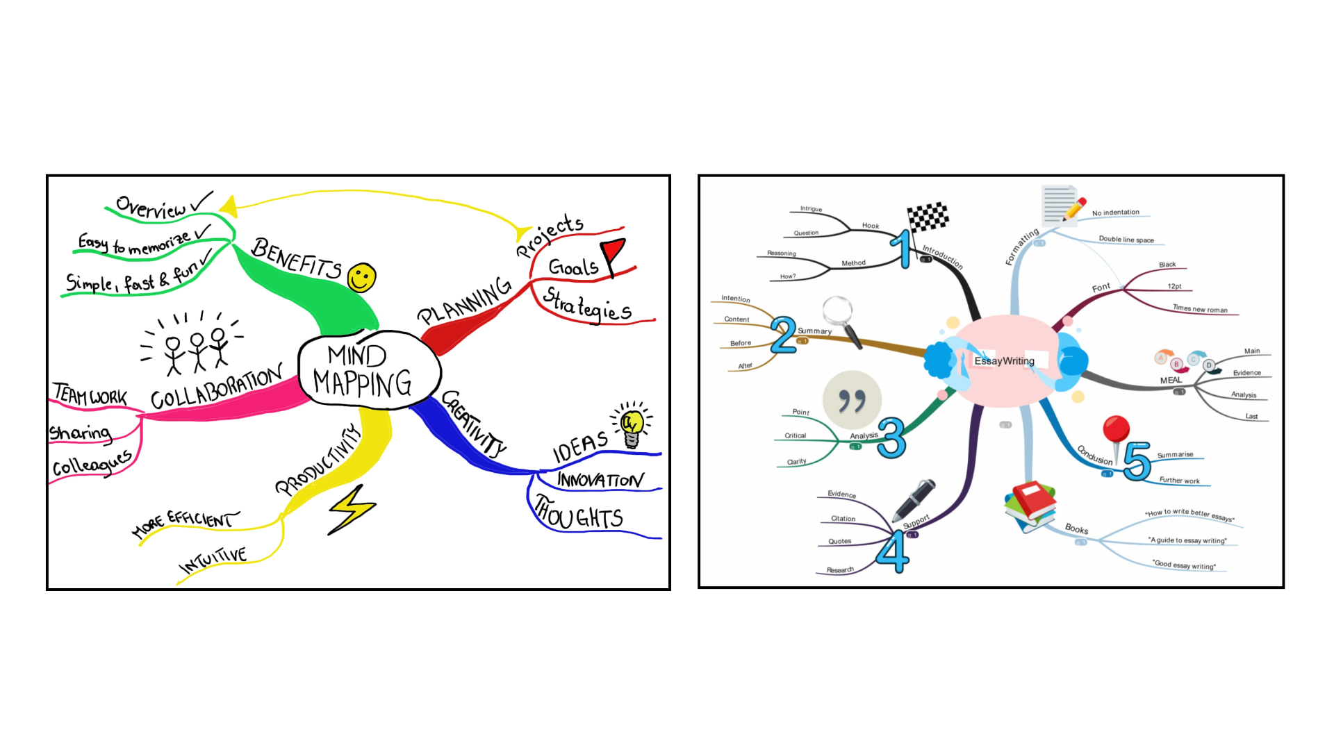 A large number of studies have shown that mind maps can enhance the learning process. Research in neuroscience and educational psychology has affirmed that: They help boost long-term memory through their use of images, colors, and an orderly visual layout. They facilitate understanding of complex texts and concepts, especially in the academic field. A study conducted at the University of London showed that students who used mind maps achieved higher grades and retained information for longer periods.
