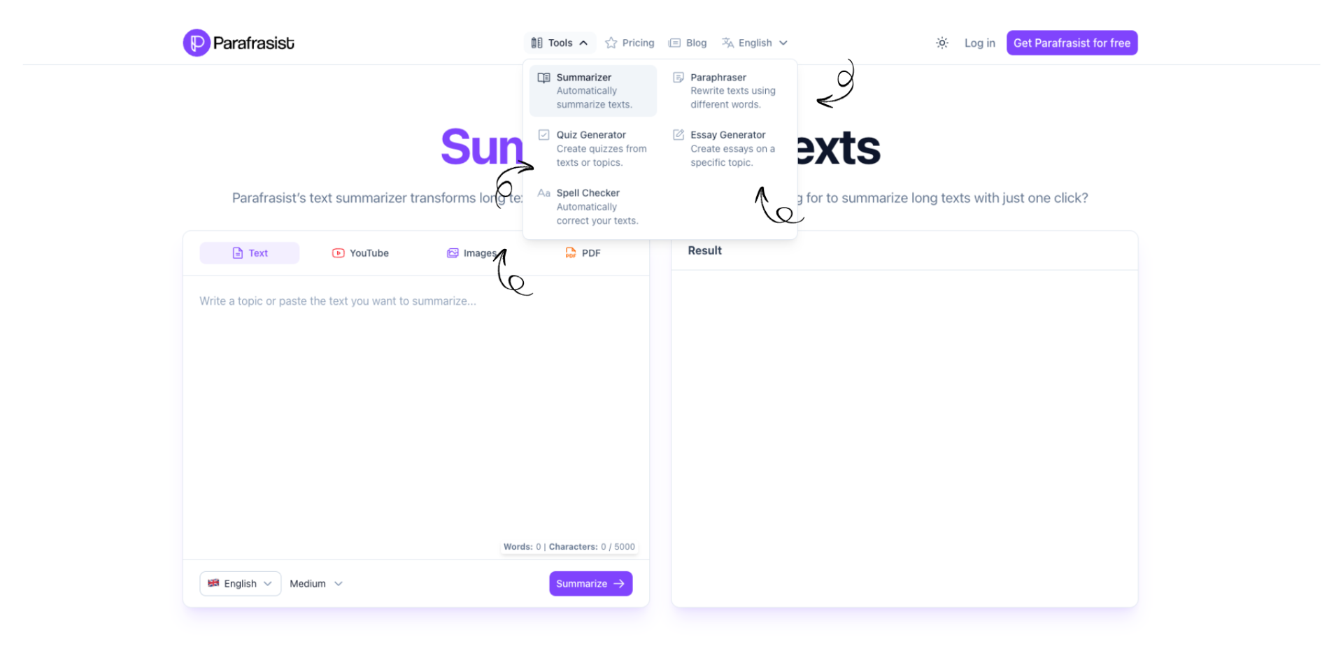 You’ll find AI-powered tools to paraphrase, summarize, write essays, correct texts, and even practice with interactive quizzes — perfect for learning antonyms and much more.